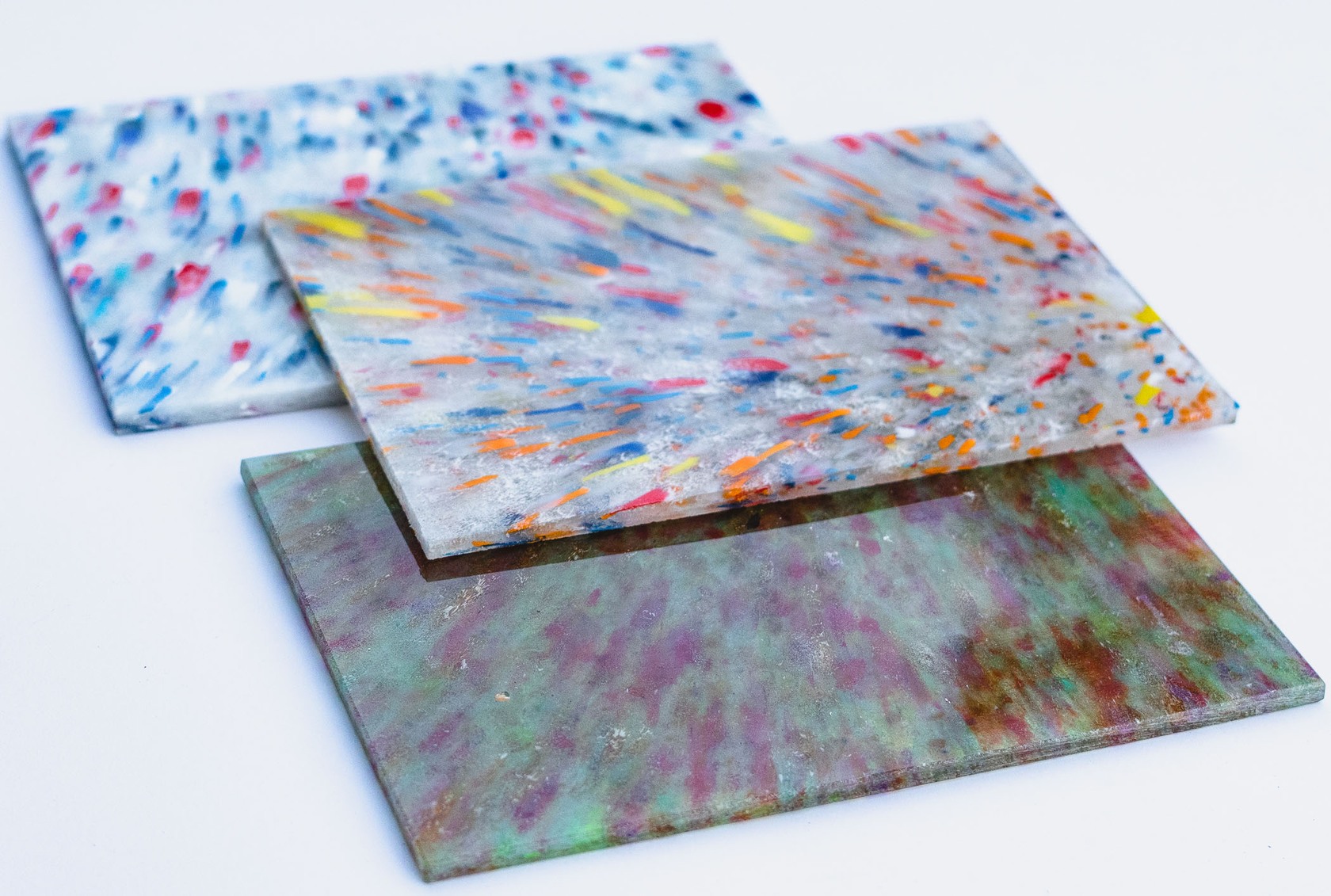 One material I’m really excited about is Polygood panels from The Good Plastic Company. They’re made from 100% recycled plastic, and their new collection taps into the translucent trend using recycled CD covers. The panels come in vibrant colors like neon green and purple and have both glossy and matte finishes. Another exciting product is Unilin’s chipboard, made of 95% recycled wood, which offers a great sustainable alternative to traditional wood products.