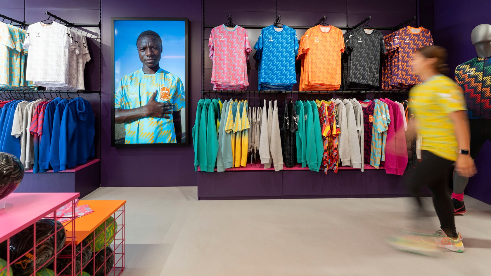 The striking orange container immediately catches your eye upon entering the clubhouse. This eye-catching feature is a recognizable element also found in various refugee camps worldwide. The clubhouse itself is a multifunctional space where all aspects of its design are tied to the brand's narrative. In close collaboration with Kelvin Govey, the creative director and co-founder of KLABU, an unconventional color palette was chosen to symbolize hope, empowerment, and vibrancy. We incorporated the playful and distinctive colors of the clothing design in the store to create an ambiance reminiscent of an actual sports clubhouse. We incorporated the vibrant and eye-catching colors from the clothing design within the store to evoke the feeling of being in a real sports clubhouse. Utilized materials such as mesh and transparent details, drawing inspiration from a football goal. Together this creates a complete experience that seamlessly blends the interior with the collection, making a bold statement.