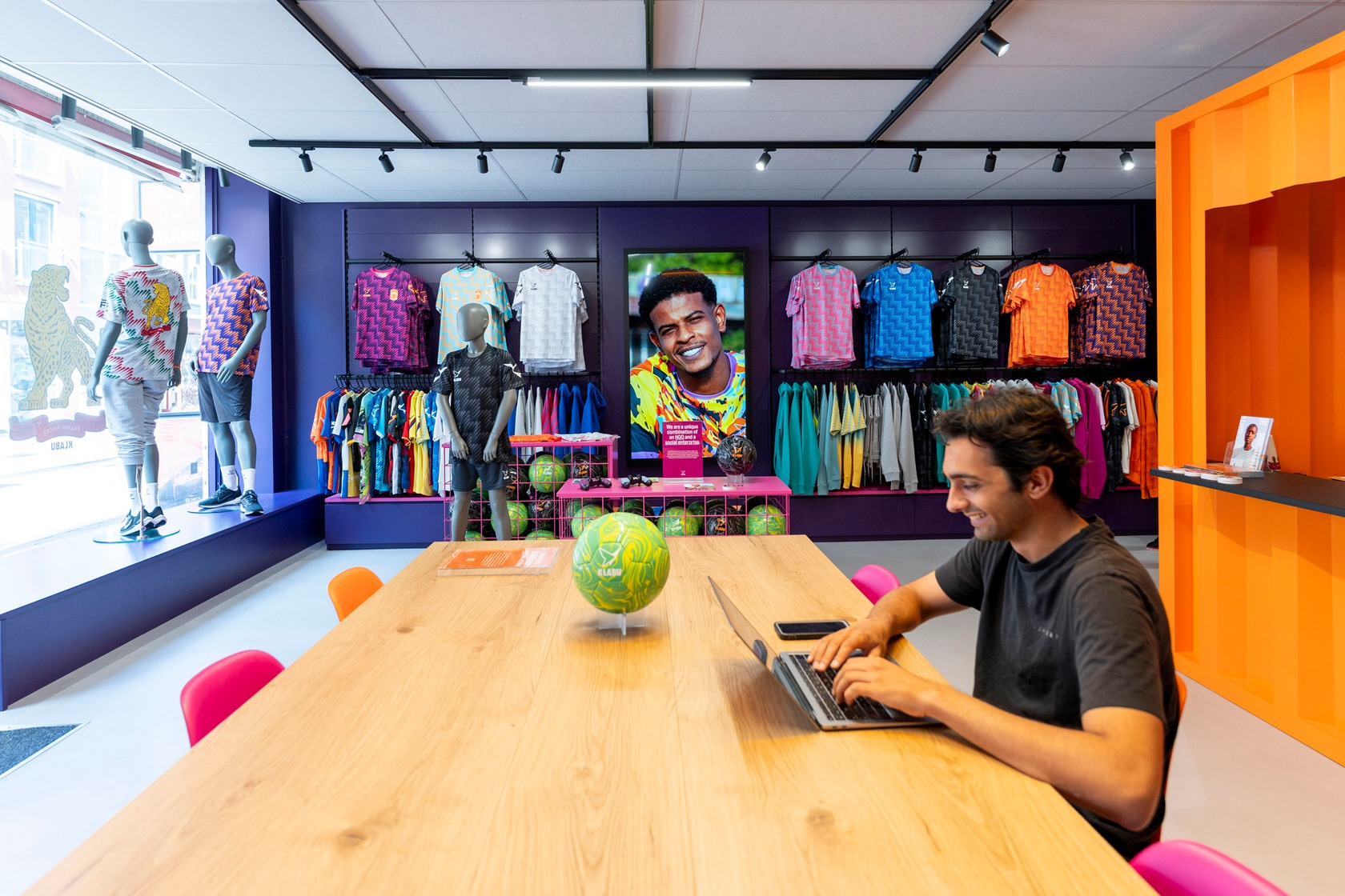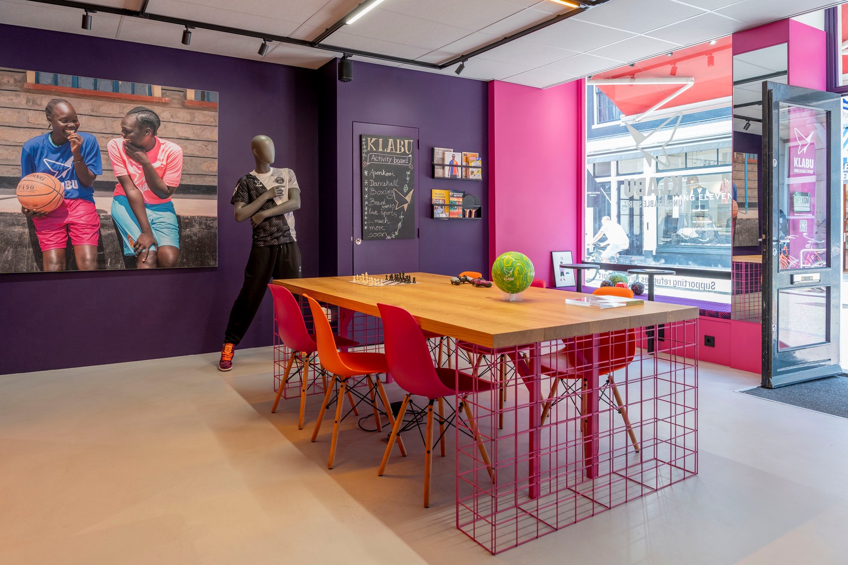 For the humanitarian sports brand KLABU, we provided our full-service approach to realize their clubhouse project in Amsterdam—a multifunctional hospitality space that includes retail, an office, and a gathering place for the community. This community comprises both locals and newcomers, including refugees, asylum seekers, and undocumented migrants. This space also serves as a commercial store where you can purchase KLABU's colorful and impactful sports collections, created to support projects for refugees. KLABU is a purpose-driven brand that leverages the power of sports and community to support refugees around the world in their journey to a better future.