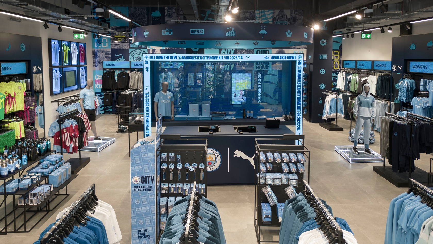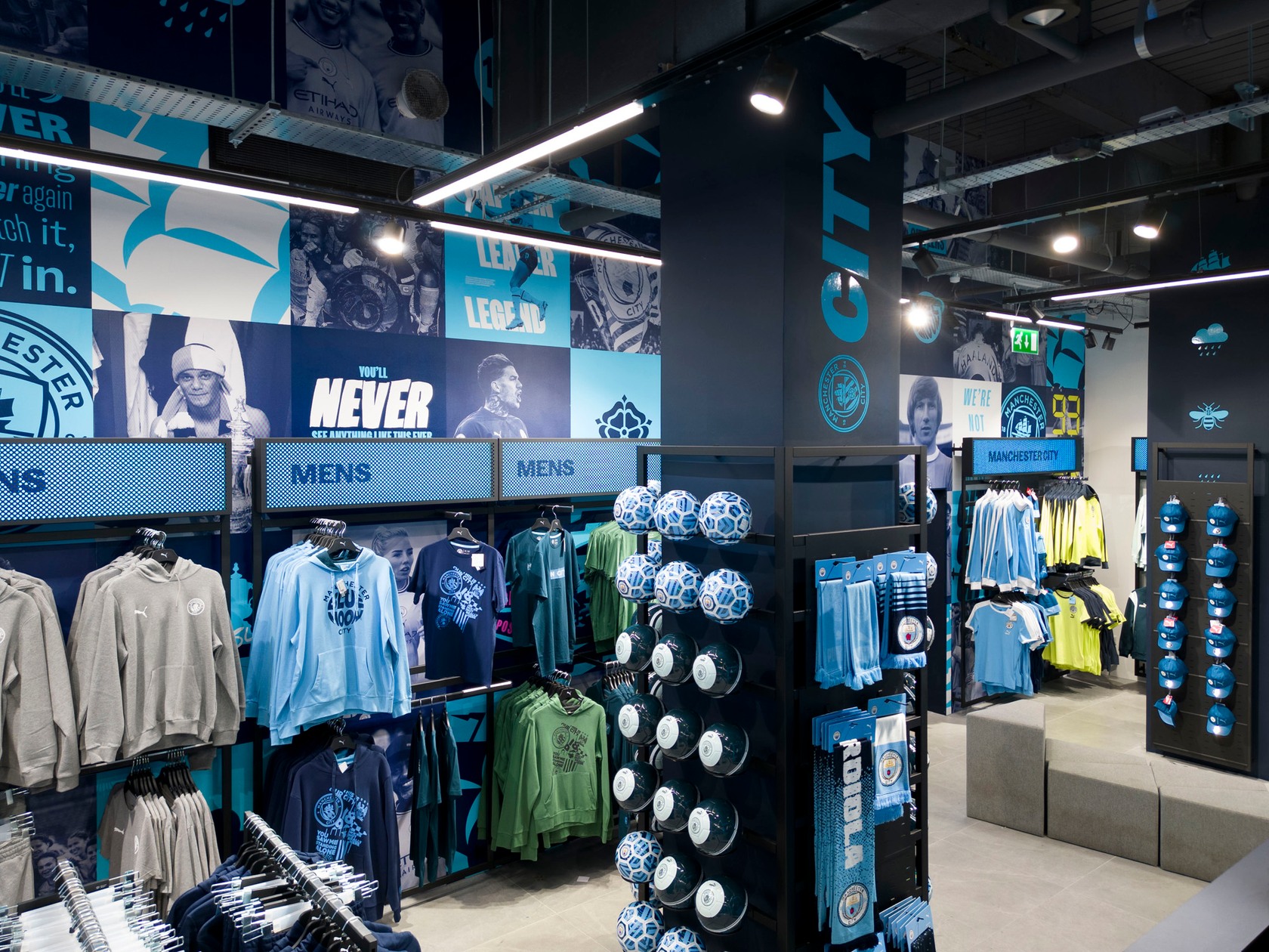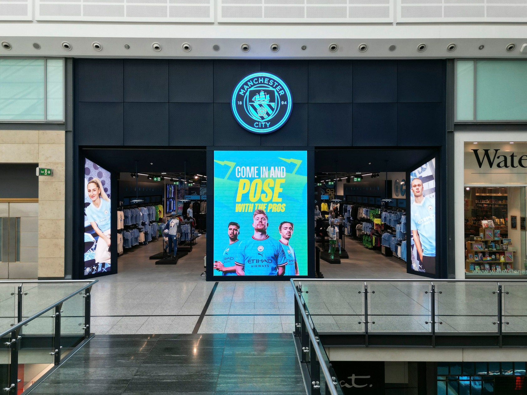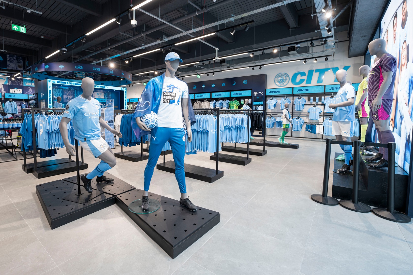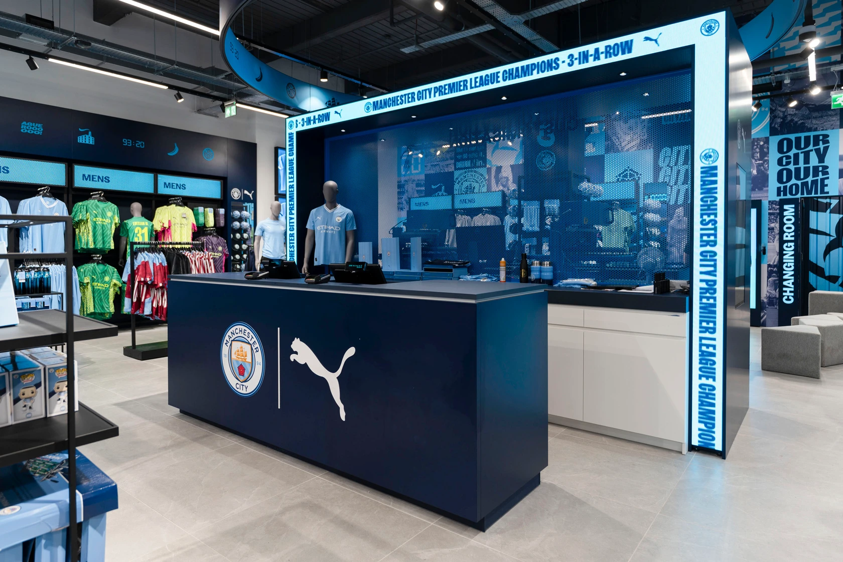 In collaboration with Puma, Stichd, and of course the club itself, we have developed the concept for a new fan shop in Manchester Arndale based on Manchester City's brand book. A concept where shop experience and passion come together. The club's colors have been incorporated, along with materials and shapes that characterize Manchester as a city. Digital elements are integrated throughout the shop, enabling supporters and visitors to truly immerse themselves in the club. They can digitally capture moments with players, personalize and purchase their favorite player's shirt, and even try on apparel in replicated stadium dressing rooms. Additionally, former club shirts are available for sale.