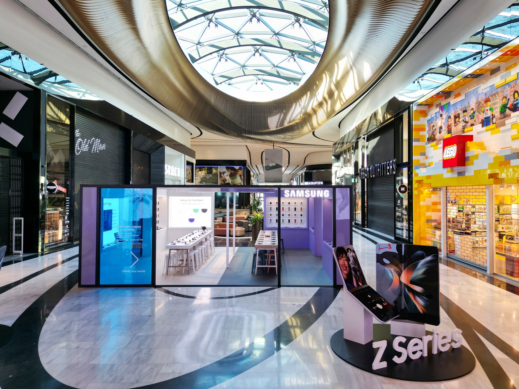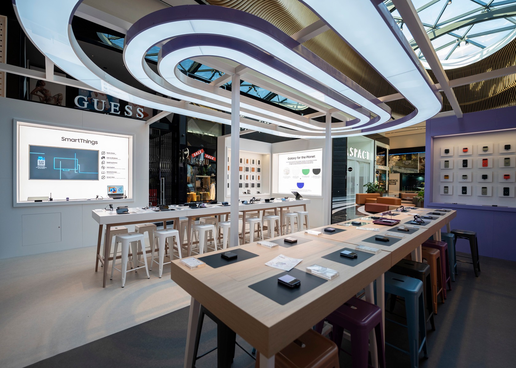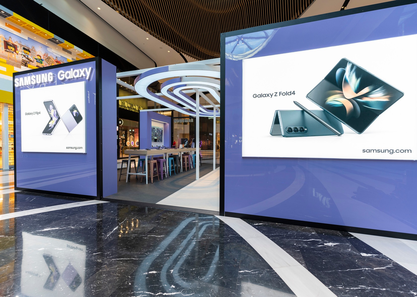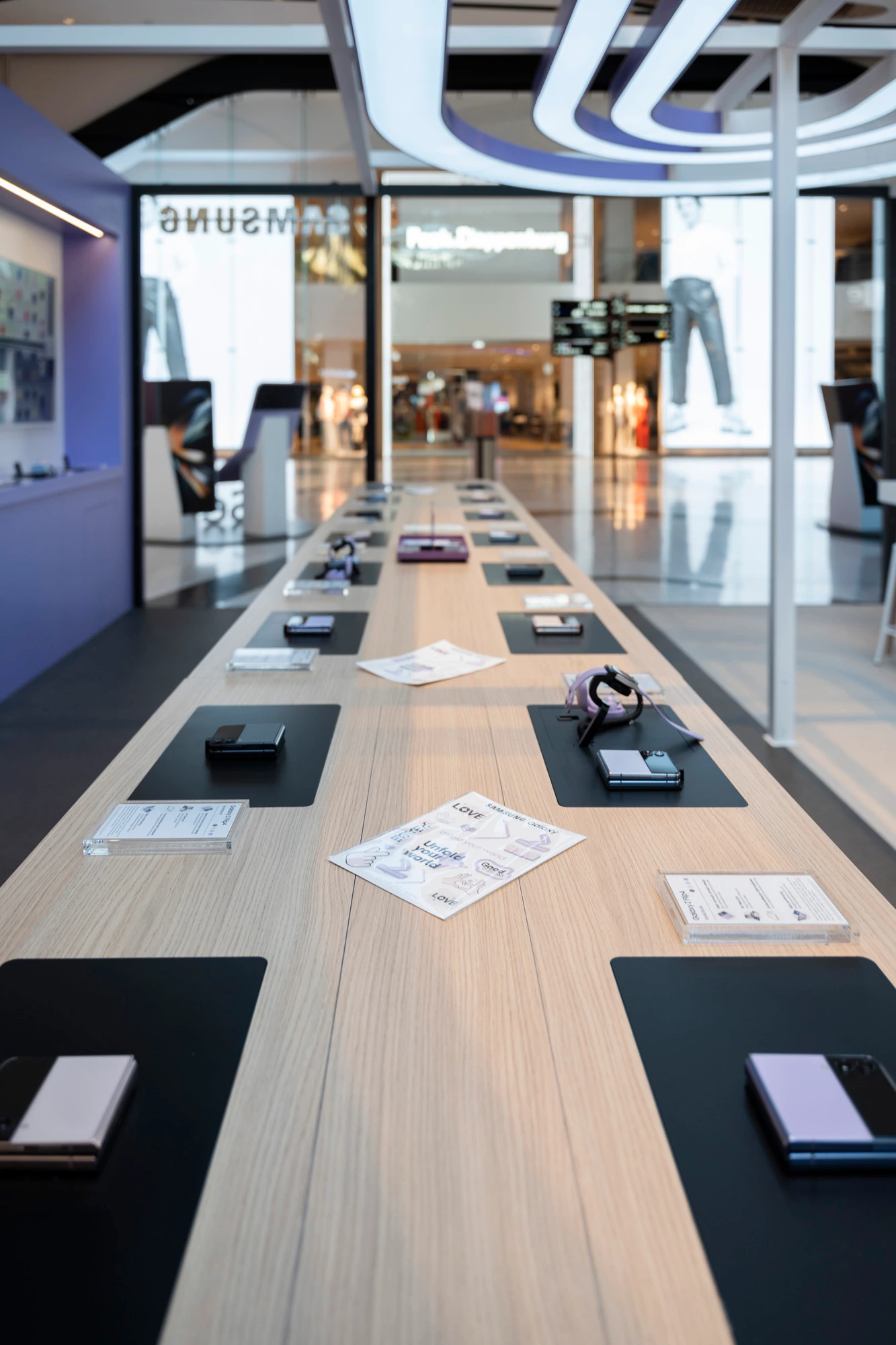 Designed to seamlessly integrate Samsung's foldable devices, the pop-up store features two distinct sections dedicated to Fold and Flip technologies. Visitors are invited to explore and experience these advancements firsthand at tables positioned at the center of the space. In addition to devices, the retail environment also highlights Samsung's range of wearables, accessories, and other smart innovations.