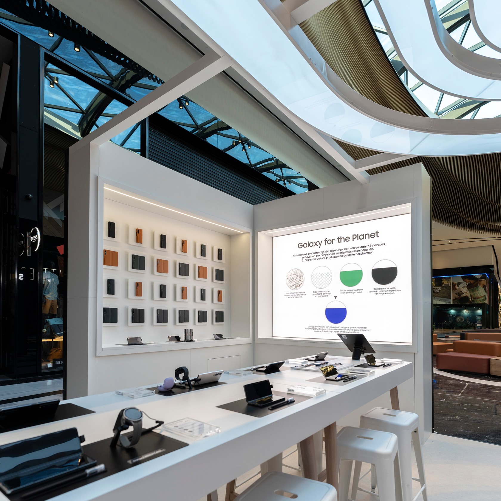 Located in the heart of Westfield Mall of the Netherlands in Leidschendam, our project in collaboration with partner agency Cheil Benelux introduces an innovative Samsung pop-up store. Spanning 8x8 meters within the mall's impressive gallery, this space showcases Samsung's cutting-edge devices in a captivating setting.